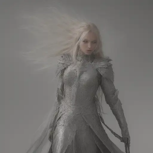 10 months ago The image depicts a woman in a fantasy setting, dressed in armor and holding a glowing sword. The woman has long, flowing blonde hair that appears to be blowing in the wind. Her attire consists of a suit of armor that is predominantly silver in color, with a high collar and a decorative design on the chest. She wears a flowing skirt or cape that is a darker shade of silver, and her sleeves are long and fitted. Her hands are clad in silver gauntlets, and she holds a sword in her right hand. The background of the image is dark and misty, with large rocks or boulders visible in the distance. The lighting is dramatic, with a bright light shining down on the woman from above, casting a glow over her armor and sword. The overall effect is one of power and strength, as if the woman is a warrior or a hero in a fantasy world. Alpha32256 0 39