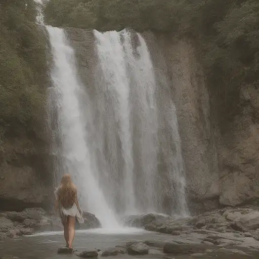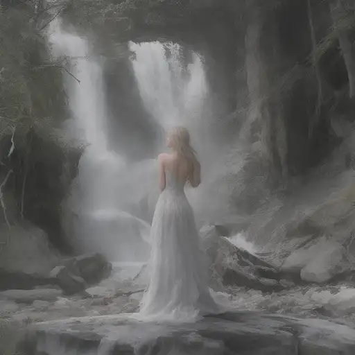 10 months ago a woman in a long, flowing dress standing in front of a waterfall, with her body facing the camera and her head turned to the left. The woman has long, wavy blonde hair that cascades down her back, and her dress is a shimmering silver color that catches the light. The dress is sleeveless, with thin straps that go over her shoulders, and it has a sweetheart neckline that accentuates her curves. The background of the image is a stunning waterfall, with water cascading down a rocky cliffside and creating a misty veil that rises into the air. The lighting in the image is soft and ethereal, with a warm glow that seems to emanate from the woman herself. Alpha32256 0 26