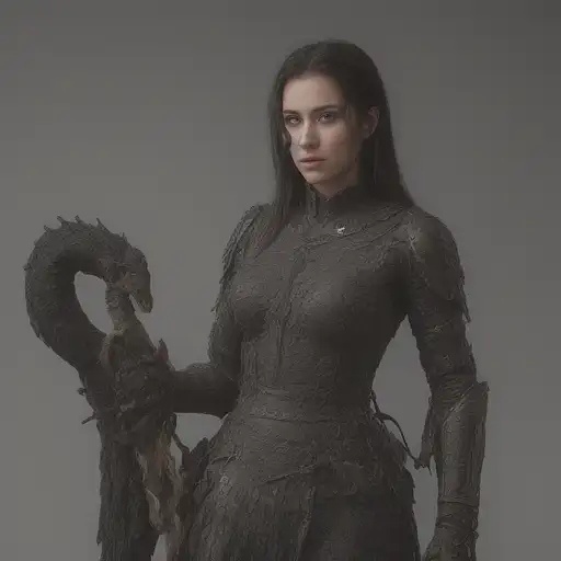 Norse Shield maiden, middle eastern, faces a black dragon, ready to strike, sword in hand, in a Norse village, long hip length jet black hair, a taut body with chiseled abdomen, glowing dark green eyes, she is adorned with armor that appears to be a form-fitting, black and gold leather ensemble with intricate bright silver accents. The leather looks supple and flexible, suggesting a high degree of craftsmanship. The corset-style top is cinched at the waist, accentuating the woman's curves. The bright silver accents are etched into the leather in an ornate, swirling pattern, adding a touch of elegance to the overall design. The arm guards are segmented, allowing for flexibility and movement. They are adorned with smaller, matching silver accents that echo the design on the corset. The leather skirt falls just bellow the waist and appears to be pleated or tiered, allowing for ease of movement. The edges of the skirt are trimmed with a thin, silver strip that catches the light. Overall, the armor seems to be designed for both functionality and aesthetics. It hugs the woman's curves, accentuating her strength and agility while also conveying a sense of beauty and craftsmanship.
