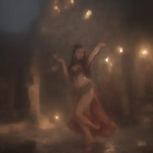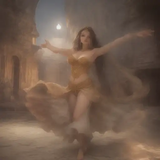 10 months ago Rays of bright full moonlight, torchlight and candle light dance around her, casting a whimsical glow over her red and gold belly dancers outfit (((swirly bokeh))) amidst a medieval castle courtyard backdrop at midnight. Soft, natural moonlight bathes her form, illuminating her sensuous pose. She stands barefoot, surrounded by vibrant flowers, her gaze captivating the viewer. Her elegant, black band encircles her neck adding to intrigue. Her hip-length wavy raven hair cascades down her back. Her back is to the camera, and she looks over her shoulder, inviting the viewer's attention. Captured with a Leica M10 and Helios-44 58mm f/2 lens, stopped down to F2.8, this fine art color photograph boasts deep, rich tones and lovely highlights. Midday sunlight enhances her radiant expression, while the soft, diffused light shines through her raven mane, highlighting her figure's contours. Alpha32256 0 35