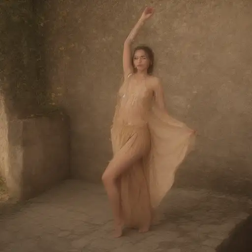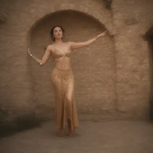 10 months ago Rays of bright full moonlight and torchlight dance around her, casting a whimsical glow over her red and gold belly dancers outfit (((swirly bokeh))) amidst a medieval castle courtyard backdrop at midnight. Soft, natural moonlight bathes her form, illuminating her sensuous pose. She stands barefoot, surrounded by vibrant flowers, her gaze captivating the viewer. Her elegant, black band encircles her neck adding to intrigue. Her hip-length wavy raven hair cascades down her back. Her back is to the camera, and she looks over her shoulder, inviting the viewer's attention. Captured with a Leica M10 and Helios-44 58mm f/2 lens, stopped down to F2.8, this fine art color photograph boasts deep, rich tones and lovely highlights. Midday sunlight enhances her radiant expression, while the soft, diffused light shines through her raven mane, highlighting her figure's contours. Alpha32256 0 56