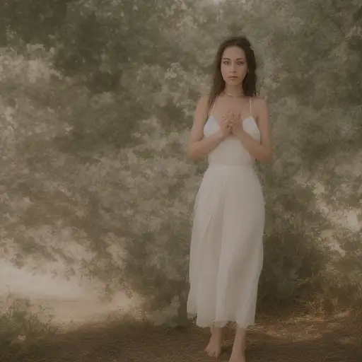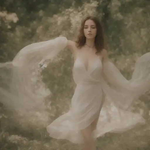 10 months ago Fireflies dance around her, casting a whimsical glow over her white silk gown (((swirly bokeh))) amidst a sunny afternoon backdrop. Soft, natural light bathes her form, illuminating her sensual pose. She stands barefoot, surrounded by vibrant flowers, her gaze captivating the viewer. Her elegant, cruel leather choker and a golden chain leading from the choker down dangles adding intrigue. Her back is to the camera, and she looks over her shoulder, inviting the viewer's attention. Captured with a Leica M10 and Helios-44 58mm f/2 lens, stopped down to F2.8, this fine art color photograph boasts deep, rich tones and lovely highlights. Broad daylight enhances her radiant expression, while the soft, diffused light shines through her long, hip-length wavy messy raven hair, highlighting her figure's contours. Alpha32256 0 8