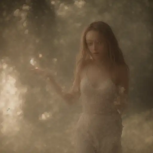 10 months ago Fireflies dance around her, casting a whimsical glow over her (((swirly bokeh))) amidst a foggy evening backdrop. Soft, golden light filters through the trees, illuminating her sensual pose. She stands barefoot, surrounded by vibrant flowers, her gaze captivating the viewer. Her elegant, and delicate leather choker add intrigue. Her back is to the camera, and she looks over her shoulder, inviting the viewer's attention. Captured with a Leica M10 and Helios-44 58mm f/2 lens, stopped down to F2.8, this fine art color photograph boasts deep, rich tones and lovely highlights. Warm backlighting enhances her sensual expression, while the soft, diffused light shines through her long, hip-length wavy messy hair, highlighting her figure's contours. Alpha32256 0 18