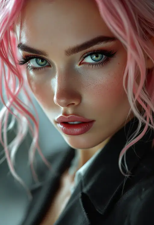 6 months ago The image is a close-up of a business girl with a detailed athletic body, highly detailed and realistic skin, realistic pores, and moles. She has a full, detailed pink hair and perfect features, seductive eyes and raised eyebrows, photorealistic hands. AngeloIA 0 29