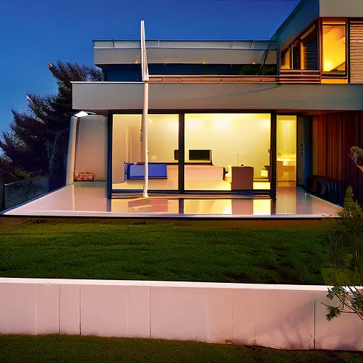 2 years ago Hyper realistic eye level exterior photo of a mid century modern style house overlooking the ocean, daylight, indirect lighting, AD magazine, Frank Lloyd, Eames, Mies van der Rohe Arphelis 0 39