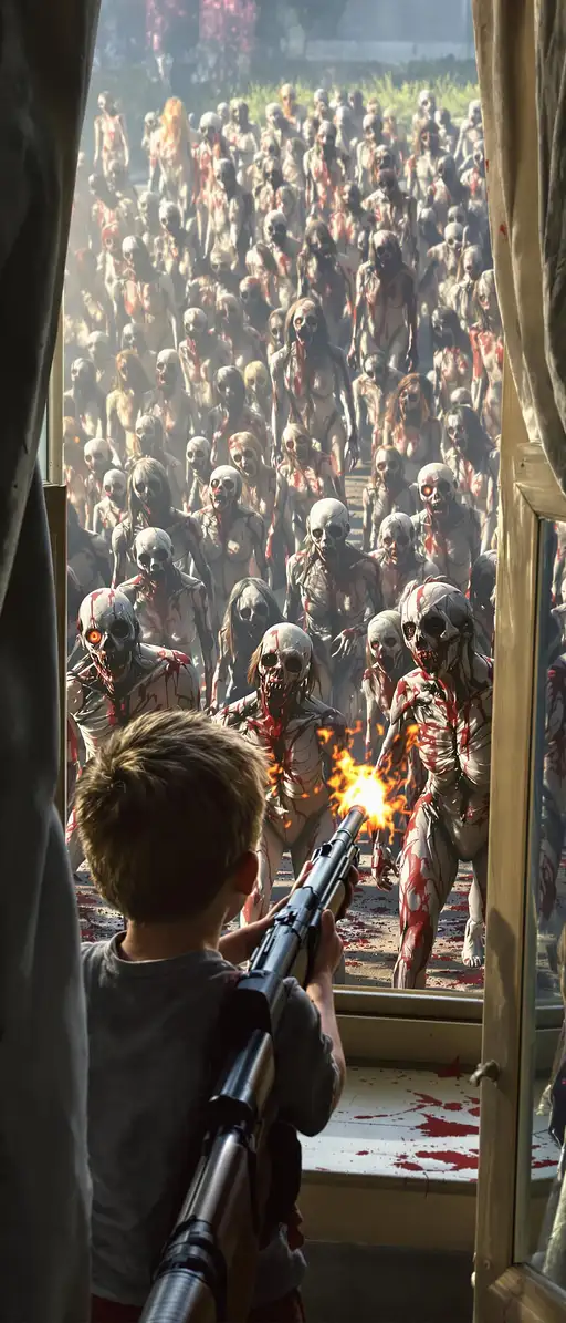 10 months ago A boy looking from a window at daylight and sees many walking womem zombies . Their body are exposed and covered with blood . The boy holds a shotgun and shooting fire and shots at them . Hyperrealistic. Hyper details . Hyper face and body details . 8k . High quality . Bebo114466 0 17