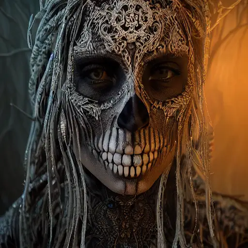 almost 3 years ago a beautiful detailed portrait of a Swamp Witch, symmetrical features, ominous, magical realism, texture, intricate, ornate, royally decorated, skull, skeleton, whirling smoke, embers, vibrant colors, fantasy, trending on artstation, volumetric lighting, micro details, 3d sculpture, ray tracing, 8k, horror, post-apocalyptic CASSELLEO83 3 200