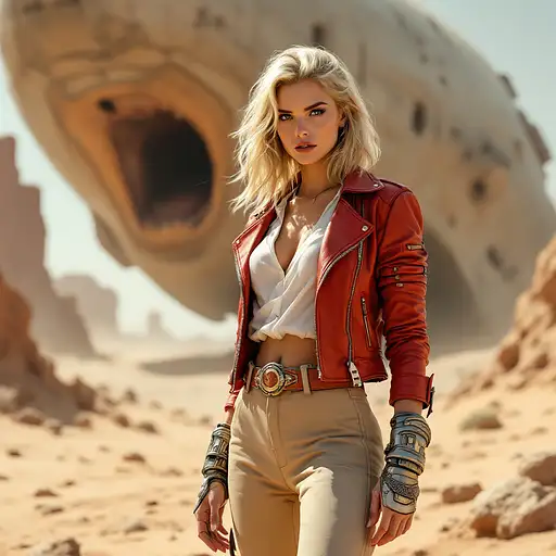A young woman with shoulder-length blonde hair and fair skin stands in a desert setting, facing the viewer. She is positioned slightly to the right of center and is looking directly at the viewer. Her expression is serious and sensual. She is wearing a white blouse and a vibrant red leather jacket, along with beige/cream pants. She has a futuristic-style belt buckle and detailed metallic wrist guards. Her body posture and clothing suggest a strong and capable personality. A large Spaceship is visible in the background, its mouth open, positioned to the left of the woman, dominating the left half of the image. The setting is a dusty, sandy desert landscape with visible space debris and rocky outcrops. The background features a large, faded, partially visible space object. The colors are soft and warm, with shades of beige, tan, red, and light gray. The light is bright and casts shadows, creating a strong sense of depth. The style is realistic yet stylized, suggesting a comic book or video game art aesthetic. The composition is a combination of a close-up view of the woman with background elements that provide context and depth of field. The perspective is from a mid-range point of view.