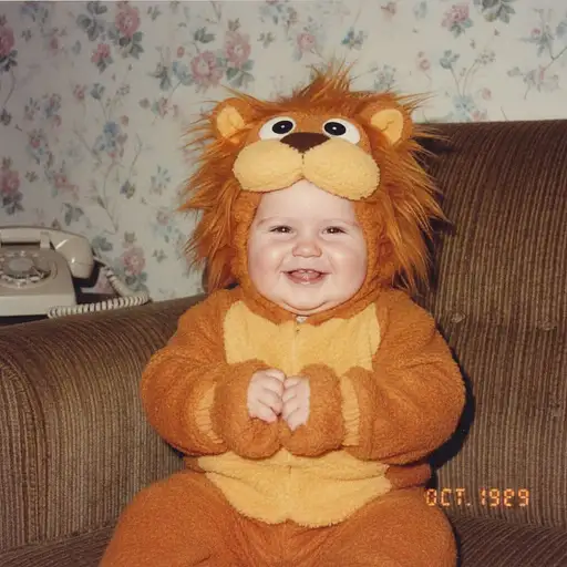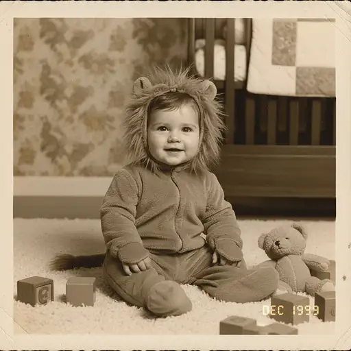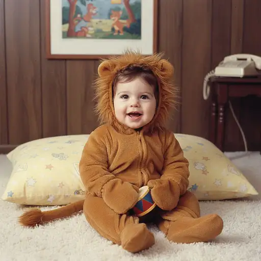 2 days ago make a baby picture from 1989, brown eyes, brown hair. lion costume, vintage photo style. Celine PRO 0 6