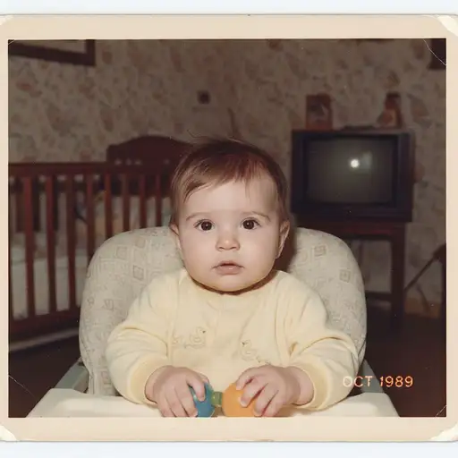 2 days ago make 6 months old baby picture from 1989, brown eyes, brown hair. not so HD, make the picture look a bit more used like a real photograph Celine PRO 0 6
