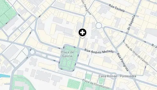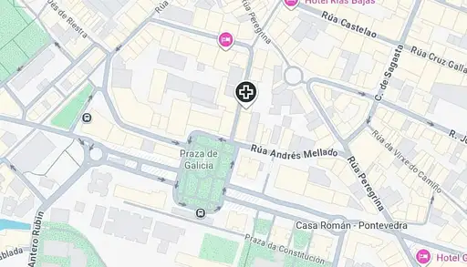 22 days ago It should show a hospital cross instead of O Sanatorio and it should show green spaces and the streets but no buildings and no text. Make it fully in black and white. The whole image is black and white. Celine PRO 0 15