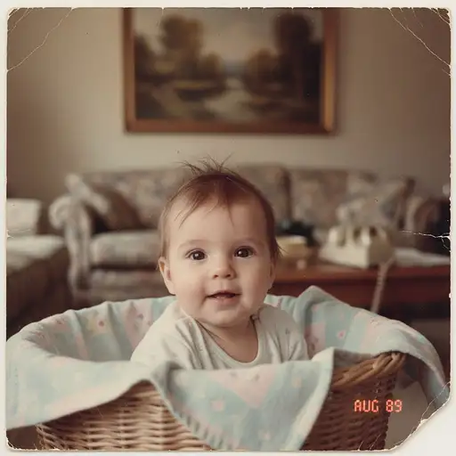2 days ago make 6 months old baby picture from 1989, brown eyes, brown hair. not so HD, make the picture look a bit more used like a real photograph Celine PRO 0 4