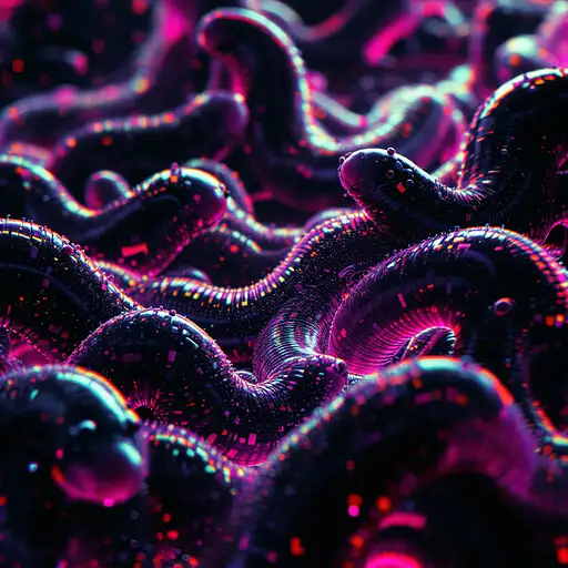 10 months ago Heavy digital distortion, glitch art aesthetic, oversaturated reds and purples, corrupted data visualization, pixelation artifacts, analog interference patterns, chromatic aberration, VHS distortion, digital decay, wavelight hint interference patterns, light hint of misty slugs, many slugs, millions of slugs Celine PRO 0 18