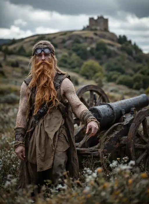 7 months ago The image depicts a person dressed in medieval attire standing next to an old cannon. The individual has a large, orange beard and is wearing round goggles on their head. They are holding a hammer in one hand and have a leather harness across their chest. The background features a grassy hill with a castle perched atop it, suggesting a historical or fantasy setting. There are also some small white flowers visible near the base of the hill. CondZero 0 42
