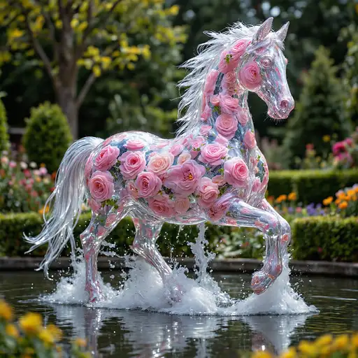 7 months ago The image depicts a highly detailed and artistic representation of a horse sculpture made entirely from glass. The horse is captured mid-stride, with its legs partially submerged in water, creating dynamic splashes around it. The inner glass body of the horse is adorned with an intricate pattern of pink roses, which are seamlessly integrated into the transparent material, giving the sculpture a vibrant and floral appearance. The background features a lush garden setting, with neatly trimmed hedges and various flowering plants adding to the serene atmosphere. The overall composition is visually striking, combining elements of nature with the elegance of glass craftsmanship. CondZero 0 18