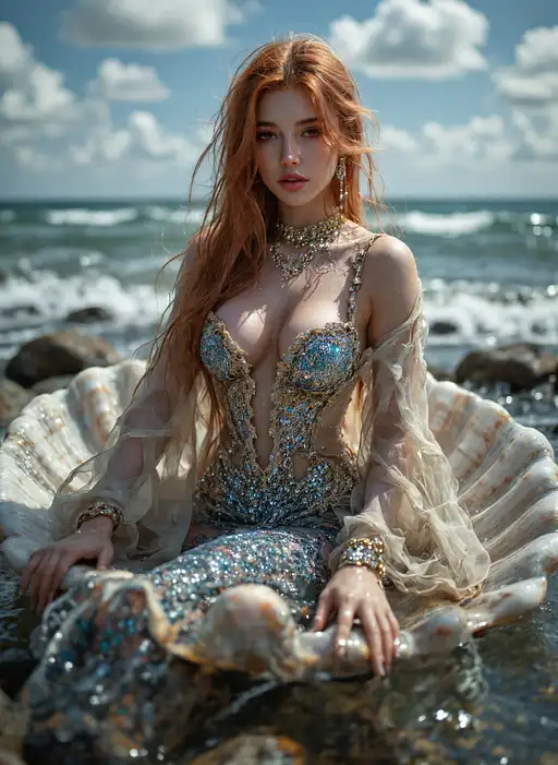 7 months ago The image depicts a ((beautiful young mermaid)) with long, flowing red hair sitting on a large seashell. The individual is wearing an elaborate costume that resembles a mermaid's tail, featuring scales and a shimmering, metallic texture that is partially submerged in the water. The costume includes a revealing corset-like top adorned with intricate patterns and embellishments. The setting appears to be near the ocean, as indicated by the water surrounding the shell and the sunlight reflecting off the surface. The overall atmosphere of the image is mystical and enchanting, capturing a moment that blends fantasy with natural beauty. CondZero 0 16