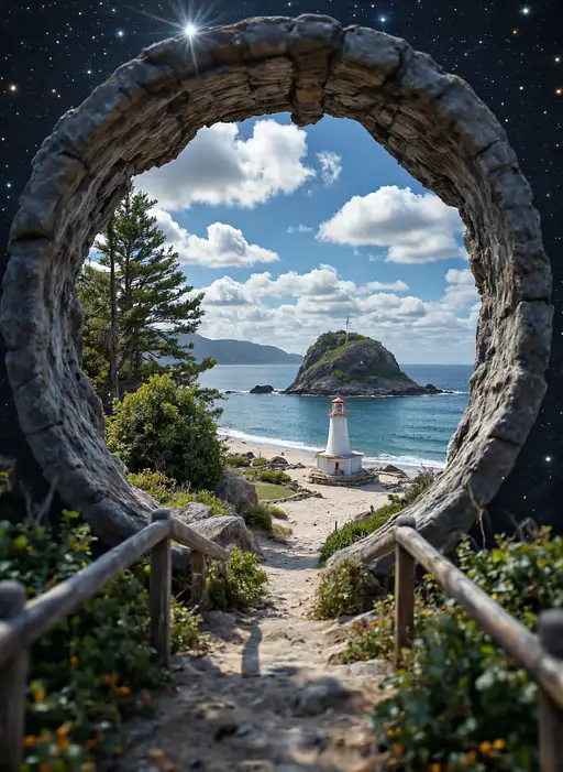 7 months ago The image depicts a fantastical landscape viewed through what appears to be a portal or window that frames the scene like a picture within a picture. This portal is set against a backdrop of outer space, with stars visible in the distance. Inside this portal, we see a serene coastal setting featuring a sandy beach leading up to a white lighthouse with a red dome on top. The lighthouse stands prominently on the right side of the image, surrounded by lush greenery and trees. The ocean extends into the horizon, displaying various shades of blue, with waves gently lapping at the shore. In the middle ground, several rocky islands rise from the sea, adding depth and interest to the composition. The sky above is partly cloudy, with fluffy white clouds scattered across a bright blue expanse. The overall atmosphere of the image is peaceful and idyllic, blending natural beauty with elements of fantasy. CondZero 0 26