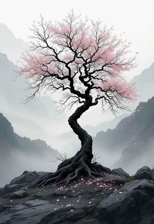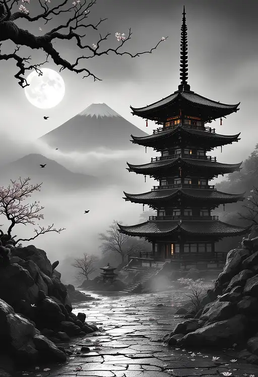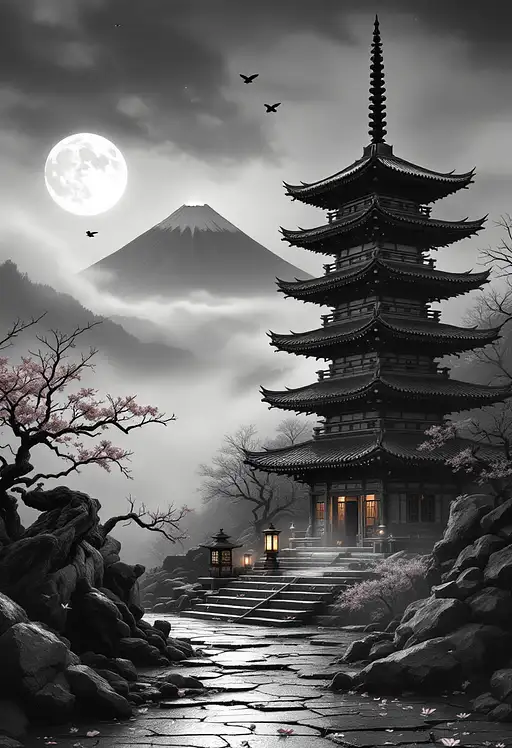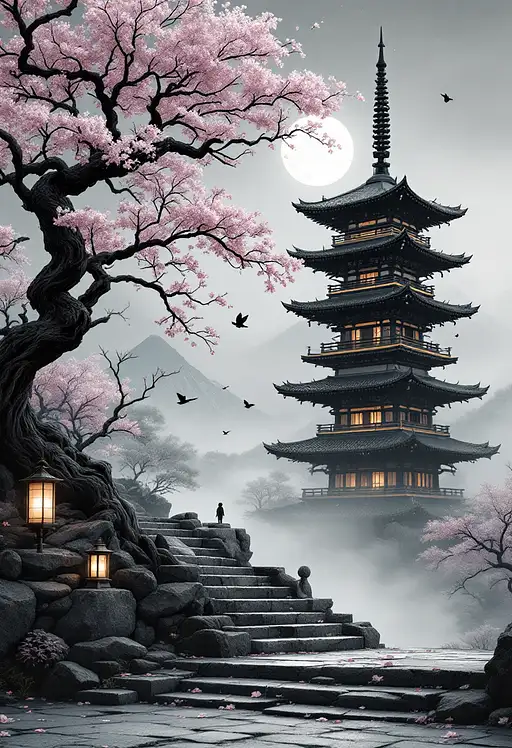 A full traditional Japanese pagoda tower, off-center right, fully visible from base to spire, uncropped. It rises from cracked ceramic tiles with hyper-detailed aged wood and layered tiled roofs, worn edges showing lichen and time. In the upper left of the frame, a few twisted sakura branches stretch inward — gnarled, dark, with sparse pink blossoms (5% saturation) — subtly echoing the ancient tree from the left-side print. warm interior glow radiates gently from within the pagoda, diffused through the mist. Warm interior glow in 2–3 pagoda windows filters through dense mist. Fog weaves between the steps. Two hanging paper lanterns with a soft warm glow by the pagoda entrance, gently swaying from either side under the tiled eaves.. Fog weaves between the steps, ceramic shards, and scattered petals. A distant volcanic mountain rests beneath a veiled moon in the background. one tiny bird silhouette flying quietly toward the left horizon . Monochrome charcoal gradients dominate the scene, with 10% white space in the sky. Ultra-realistic ink-wash tone, deep shadows, cinematic depth of field. Ghost of Tsushima melancholy.