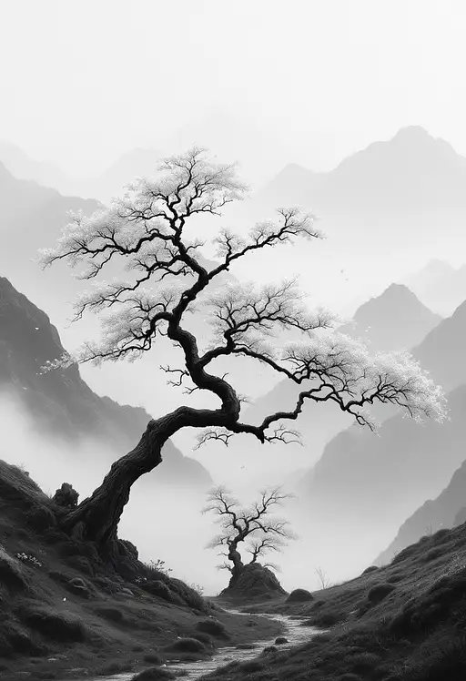 6 months ago cinematic grayscale, single Japanese tree in a foggy mountain valley, soft contrast and muted tones throughout the scene. Tree is centered, with a calm and natural shape. Visible trunk and branches with soft curves nothing exaggerated or overly twisted. A few delicate blossoms are allowed, but no full bloom or bright pink colors. Petals should be soft, minimal, and slightly faded. No cliffs, no dramatic landscapes. The tree should sit on natural ground. Deep atmospheric fog in the background with layered mountains fading into the distance. Scene should feel quiet, timeless, and balanced. Ink-wash painting aesthetic with a peaceful, cinematic mood. Cosmopolitan86 0 29