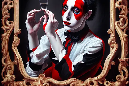 over 2 years ago mdjrny -v4 style, an oil painting of a French mime behind a glass window, cinematic light, sad, highly detailed, black, red, white, very strong brush strokes, oil painting DD137 0 55