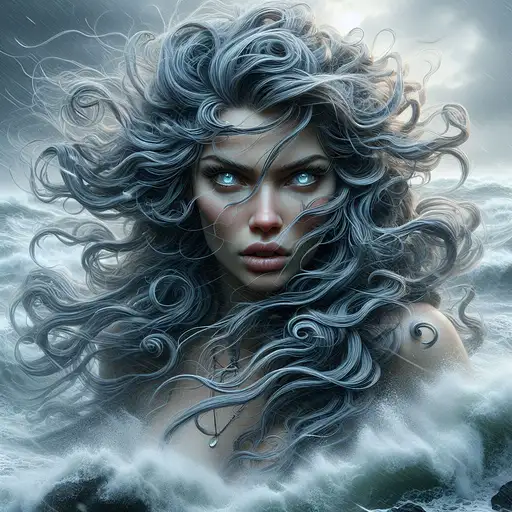over 1 year ago On a stormy, windswept coastline, Nimbus, a tempestuous sea witch, commands the raging elements with ease. The photorealistic 3D image captures every intricate detail of her swirling, watery form, as it merges with the crashing waves and howling winds. Her wild, untamed hair and intense, glowing eyes convey her unbridled power, as she embodies the essence of chaos and unpredictability. The stunning realism of the portrait brings Nimbus' enchanting beauty and powerful presence DEROUICHE 9 260