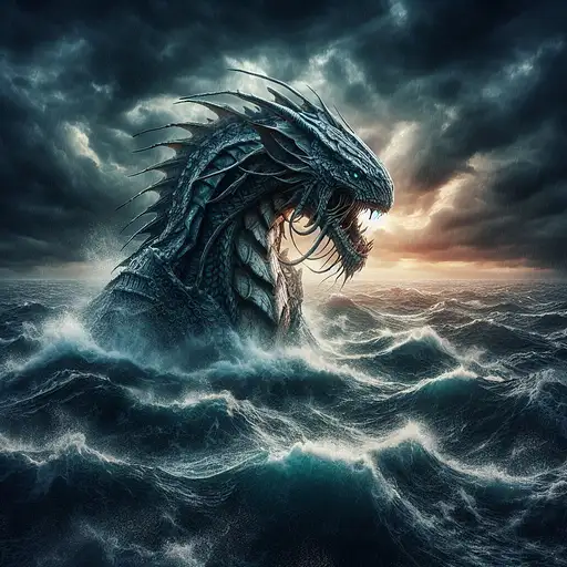 over 1 year ago On the edge of a vast, storm-tossed sea, Leviathan, a fearsome and majestic sea monster, rules the depths with unmatched power and grace. The dramatic, ever-changing light of the stormy skies and the deep, dark waters casts deep, dynamic shadows on his intricate, scale-covered form, revealing the subtle, bioluminescent patterns that mark his deep connection to the primal forces of the ocean and his unrivaled mastery of the underwater realm. DEROUICHE 7 240
