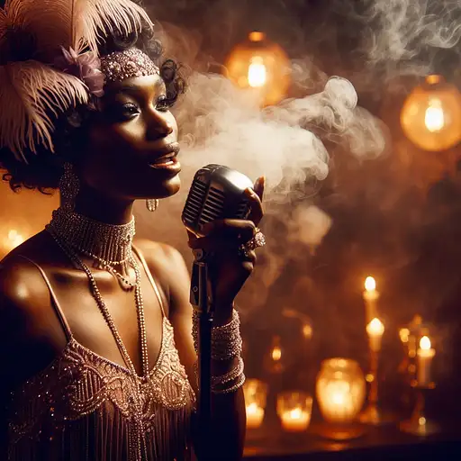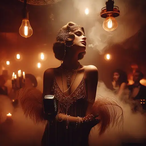 over 1 year ago In the dimly lit, smoke-filled confines of a clandestine underground speakeasy, Violet, a charismatic human jazz singer, captivates her audience with her sultry voice and enchanting presence. The warm, soft glow of vintage light bulbs and flickering candles casts a romantic, atmospheric light on her intricate, beaded flapper dress and the delicate, feather-adorned accessories that accentuate her captivating performance. DEROUICHE 1 97