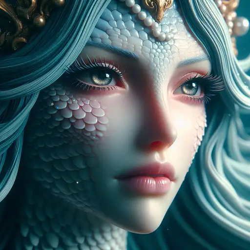 over 1 year ago In a stunningly detailed, close-up portrait, Giant Shirahoshi, the legendary mermaid princess of One Piece, reveals her ethereal beauty and otherworldly allure. The photorealistic image captures every intricate detail of her facial features, with her expressive eyes and delicate lips conveying her gentle nature. The soft, diffused ocean light illuminates her regal, shimmering crown and cascading hair, while subtly hinting at her scaled lower body DEROUICHE 3 130