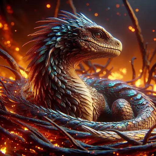 over 1 year ago Chimeric basilisk eidolon, half-human half-reptilian with burnished metallic-shimmering scales. Model every feather with infinite subdivisions in hypnotic swirling patterns. Set amid a giant cradling nest of charred branches in a primal world's twilight consumed by flames. Render 16K capturing each glistening highlight. DEROUICHE 2 80