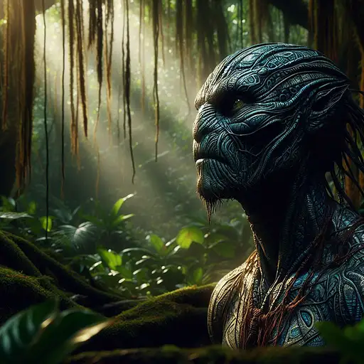 over 1 year ago In the heart of a dense, overgrown jungle, K'tal, a wise and ancient lizardman shaman, communicates with the spirits of nature. The dappled, filtered sunlight casts intricate patterns of light and shadow on his detailed, scale-covered form, revealing the intricate, tattoo-like markings that signify his deep connection to the primal forces of the natural world. DEROUICHE 2 69