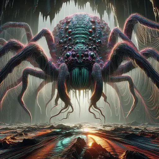 over 1 year ago Massive arachnid queen with multitudes of tentacle limbs laden with quivering cilia and obsidian eyes. Her iridescent carapace diffracting rainbows across the shadows of a vast, stalactite-adorned cavern. Simulate intense volumetric effects of her oozing organic bodily fluids. Localized dramatic lighting on her imposing figure. DEROUICHE 1 39