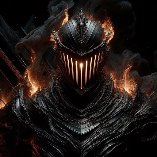 over 1 year ago Living darkness warrior, smoldering obsidian armor perfectly smooth reflecting the slightest ray. Behind the visor, two vertical slits revealing a burning gaze. Combining motion capture and real-time 3D rendering for hysterically fluid movements. Slicing through the surrounding air with sharp shadowy specters textured by volumetric ray casting. All in shades of absolute black on a nightmarish backdrop. DEROUICHE 2 76
