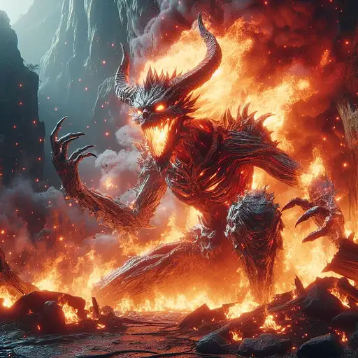 over 1 year ago a breathtaking 3D rendering featuring The Demon of Hatred from Sekiro: Shadows Die Twice. Immerse the demon in a fiery and desolate natural environment, capturing the tumultuous rage that defines its character. Utilize advanced 3D techniques to intricately detail the demon's monstrous form, with flames billowing around it. Freeze a moment that encapsulates the ferocity and despair of this formidable opponent. Infuse the scene with an atmosphere that reflects the intense DEROUICHE 5 150