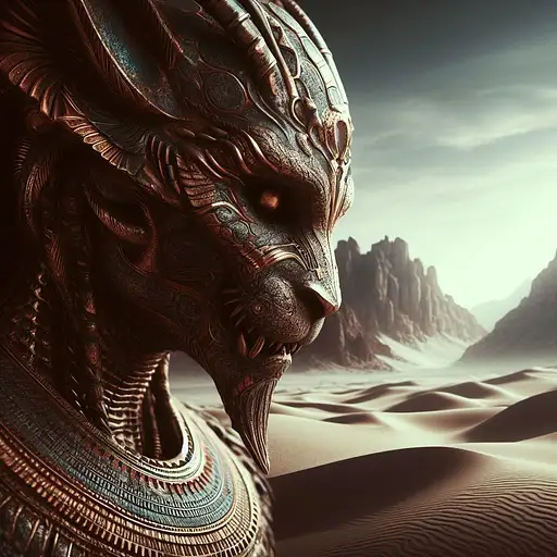 over 1 year ago Design a photograph of the Egyptian god Set, with his distinctive animalistic features, in a desolate desert landscape. Use a muted color palette and dramatic lighting to create a sense of mystery and danger, and incorporate intricate textures such as the scales on his skin and the sand on the ground. DEROUICHE 1 70