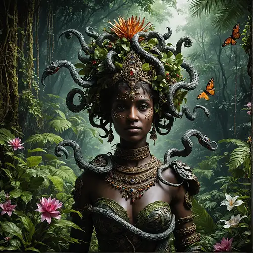 over 1 year ago In this portrait, Yemoja is depicted in her Serpent's Embrace skin, surrounded by a lush jungle environment. She wears a crown of snakes, and her body is adorned with intricate scales. The environment around her is vibrant and alive, with exotic plants and animals all around. The use of advanced lighting and shading techniques, combined with high-quality textures and materials, create a stunningly realistic and captivating scene. DEROUICHE 2 120