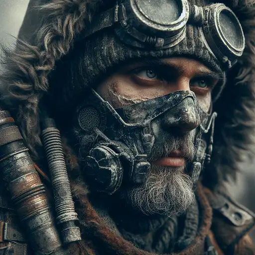 over 1 year ago Design a photograph of a post-apocalyptic survivor, with weathered clothing and gear that reflects the harsh environment they live in. Use a desaturated color palette and gritty textures to convey the harshness of the world, and capture a determined expression on the survivor's face that shows their resilience and strength. DEROUICHE 1 110