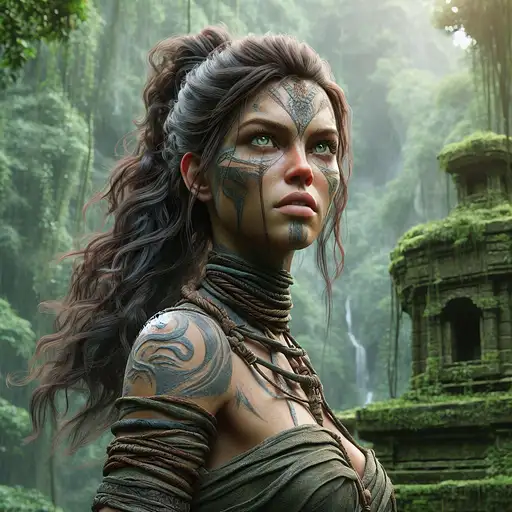 over 1 year ago In a lush, overgrown jungle, Eira, a fierce, agile warrior-queen, stands atop an ancient stone temple, her eyes scanning the horizon for threats. The artistic 3D portrait, utilizing advanced lighting and texture mapping techniques, captures every photorealistic detail, showcasing Eira's powerful, athletic form and intricate, tribal adornments in a visually stunning, faithful representation that embodies her strength, courage, and unwavering leadership. DEROUICHE 0 82
