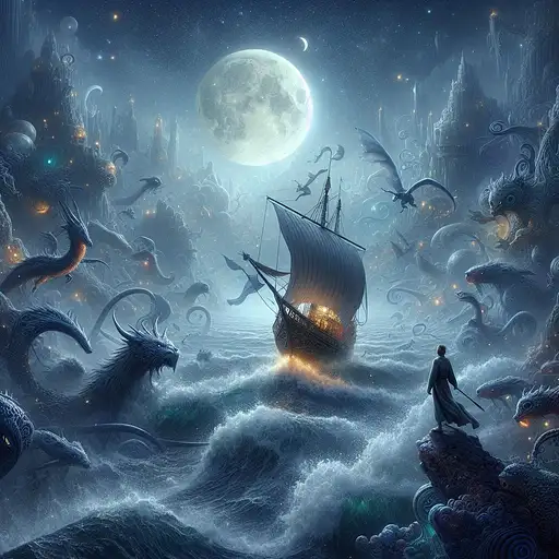 over 1 year ago On a moonlit, mystical sea, Sinbad the Sailor navigates treacherous waters, his ship surrounded by mythical creatures and awe-inspiring landscapes. The artistic 3D portrait, using expert texture mapping and atmospheric effects, captures the epic, awe-inspiring scene, emphasizing the spirit of adventure and the extraordinary tales found within "The Thousand and One Nights." DEROUICHE 1 110