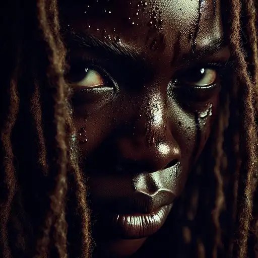 over 1 year ago Close-up on Michonne's face, beaded with sweat and grime, her tousled dreads clinging to her chiseled forehead. Her intense gaze drills into the viewer in a semi-ominous gloom. Dramatically illuminate the shadows of her features with dancing light from the blaze of a wrecked backdrop. DEROUICHE 1 72