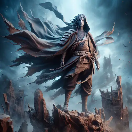 over 1 year ago In a mystical, war-torn landscape, Madara, the legendary, powerful ninja, stands triumphantly atop a crumbling, ancient ruin, his cloak billowing dramatically in the wind. The artistic 3D portrait captures every intricate, photorealistic detail, as the masterful use of volumetric lighting, reflection, and texture mapping brings the imposing, charismatic figure to life. The atmospheric, battle-scarred environment, the striking, realistic facial features, and the dynamic, lifelike pose showcase Madara's dominance, elegance, and unmatched power, immortalizing the iconic character in a visually stunning, breathtaking tribute. DEROUICHE 1 220