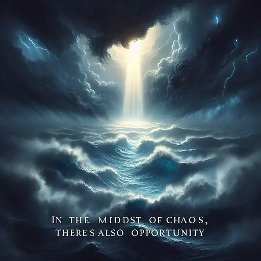 over 1 year ago texte: "In the midst of chaos, there is also opportunity." Image: A powerful storm brewing over a turbulent sea, with a single beam of light breaking through the dark clouds. Concept: Symbolizing resilience and finding opportunities for growth and transformation in the face of adversity. DEROUICHE 2 130