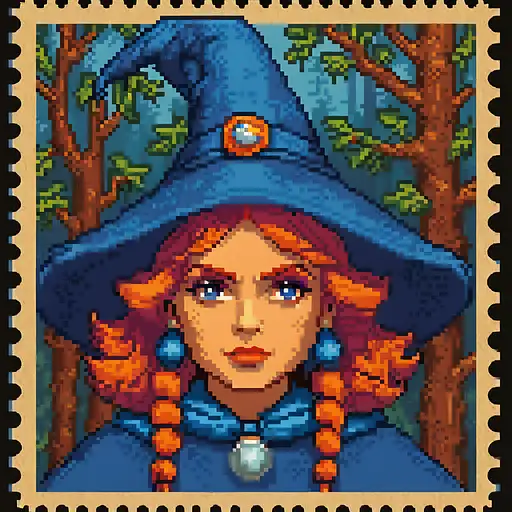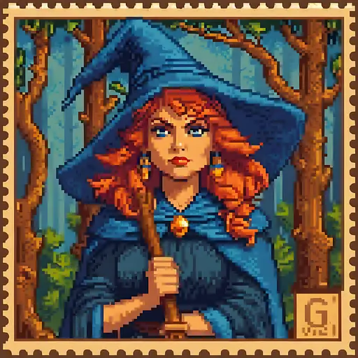 almost 2 years ago Angry female witch in the forest with arms crossed wearing a blue pointy hat and orange hair and a blue cape and blue cloak, (((facing viewer))), 64 bits Pixel Art, DR3NKS 0 110