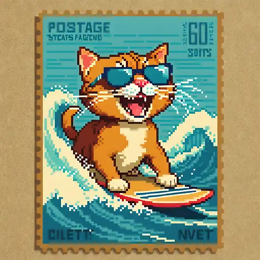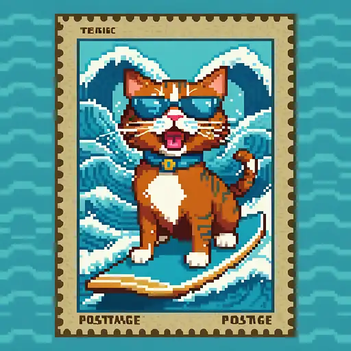 almost 2 years ago cat surfing on a surfboard, high waves, cat wearing sunglasses, cat has mouth open (((facing viewer))), 64 bits Pixel Art DR3NKS 3 130