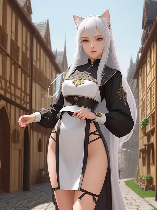 2 years ago A young beautiful cat-girl. Cat ears. Cat's tail. A beautiful face. Beautiful eyes. Clear eyes. A clear face. A fantastic face. Fantastic eyes. Slender body. Full body. In light adventurer gear. Middle Ages. Detailed clothing. Symmetrical clothing. Against the background of a medieval settlement. A mysterious and sinister expression on his face. Dynamic pose. Ultra quality. High detail. Masterpiece. ArtStation. DarlingCat 1 250