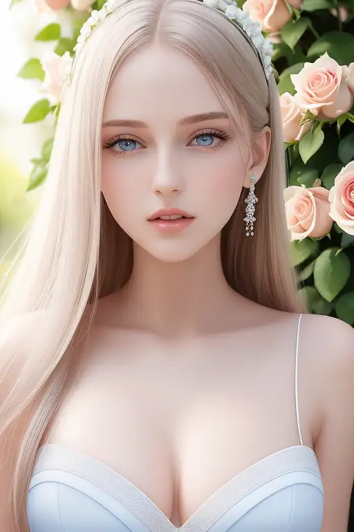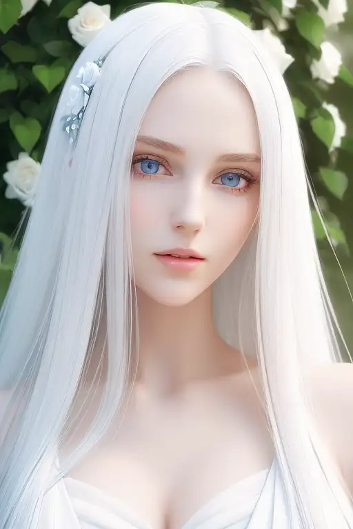 over 2 years ago Beautiful young girl. Slender body.In a white dress. Long white hair. Light blue pupils of the eyes. Fantastic face. Fantastic eyes. Against the background of bushes with red roses. Beautiful face. Realistic face. Detailed face. Beautiful eyes. Detailed eyes. Realistic. High quality picture. Detailed picture. Masterpiece. ArtStation. A high resolution. DarlingCat 1 160