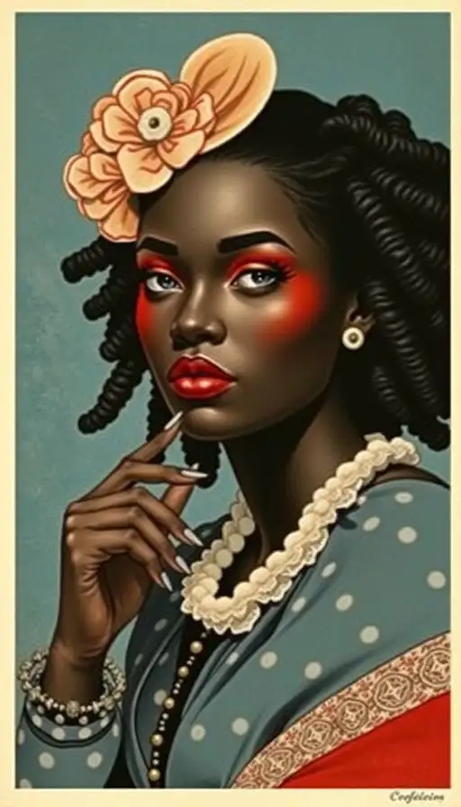 22 days ago black-woman-dark-skin-meschini-pochoir-pierrot-pierrette-woman-art-deco-original-1920s-postcard--surrealism, baroque pop, symmetrical composition, Mark Ryden and Romare Bearden style Demi444 PRO 0 31