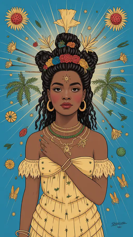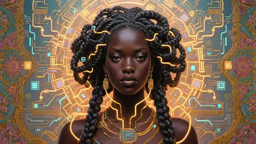 1 month ago "Afro-Surrealist image of a Black woman with intricate braids intertwined with glowing circuits, representing the intersection of traditional culture and technology."-surrealism, baroque pop, symmetrical composition, Mark Ryden and Romare Bearden style Demi444 PRO 0 23