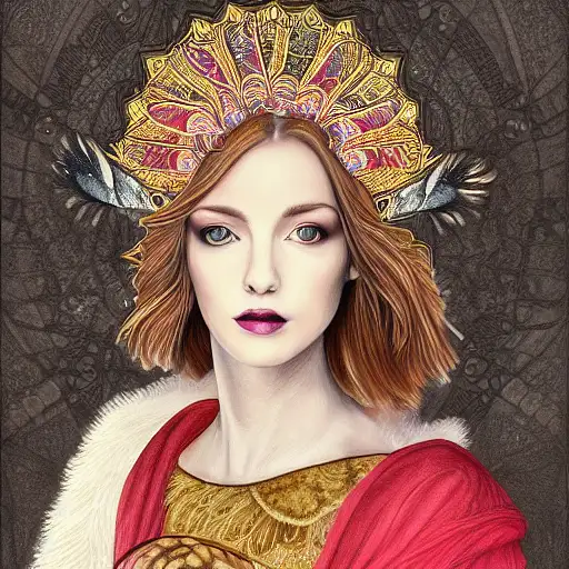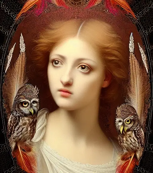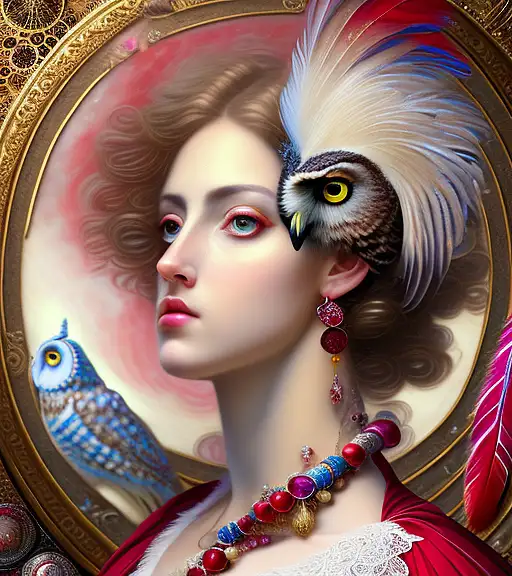 over 2 years ago high resolution 8k, raffaello master painter, Byzantine artwork, Owl, beautiful young lady close up face profile, feathers, intricate background, psychedelic hair, elegant white lace robe, hen, steampunk ,gemstones, 8k, vivid colours, floating, ruby, red accents, delicate features, gold, volumetric lighting, , --ar 12:24 --chaos 35 --uplight Dianozza 0 34