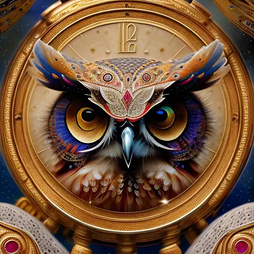 over 2 years ago high resolution 8k, Balla master painter, Byzantine artwork, Owl, Cat's eyes, feathers, intricate background, Owl, steampunk ,gemstones, 8k, vivid colours, floating, ruby, green accents, delicate features, gold, volumetric lighting, , --ar 12:24 --chaos 35 --uplight Dianozza 0 79