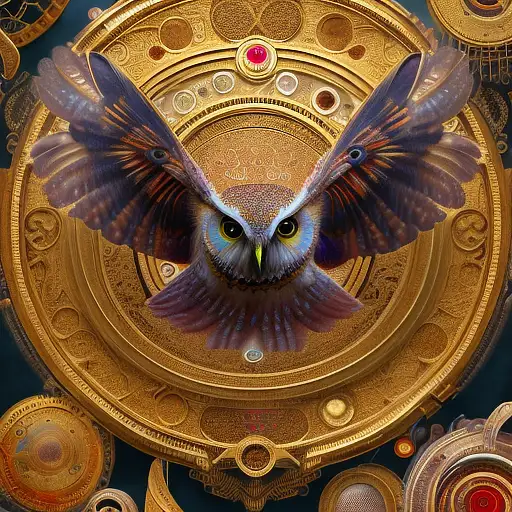 over 2 years ago high resolution 8k, Balla master painter, Byzantine artwork, Owl, feathers, intricate background, Owl, steampunk ,gemstones, 8k, vivid colours, floating, ruby, green accents, delicate features, gold, volumetric lighting, , --ar 12:24 --chaos 35 --uplight Dianozza 0 180